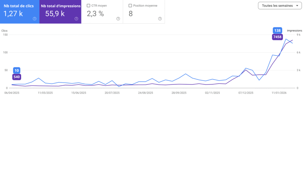 Les résultats ont suivi une courbe classique : légère baisse de visibilité en milieu d’année pendant que Google réévalue le site, puis remontée progressive pour finir au-dessus du point de départ en janvier 2026.